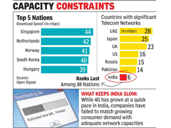 టెలికాం నెట్ వర్క్ ల సామర్థ్య లేమి వల్లే ఇండియాలో 4జి స్పీడ్ ఆశించిన స్థాయిలో లేదని ఓపెన్ సిగ్నల్ సంస్థ తెలిపింది. '3జి కంటే వేగవంతమైన ఇంటర్నెట్ సర్వీస్ అందించడంలో 4జి నెట్ వర్క్ అంతగా సఫలం కాలేదు' అని సంస్థ పేర్కొంది.
