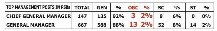 ఆ సమాచారం ప్రకారం.. ప్రభుత్వ రంగ బ్యాంకులలో జనరల్ మేనేజర్, చీఫ్ జనరల్ మేనేజర్ పదవుల్లో ఉన్నవారిలో 88 నుంచి 92 శాతం మంది జనరల్ కేటగిరీకి చెందినవారు.