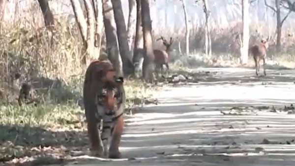 వేటను పట్టించుకోని పులిని మీరు ఎప్పుడైనా చూశారా? చూడకపోతే ఈ వీడియోను చూడాలి. ప్రస్తుతం ఇంటర్నెట్లో హల్చల్ చేస్తున్నవీడియోలో ఒక పులి దాని వెనుక రెండు జింకలు నడుస్తుండగా మామూలుగా దూరంగా వెళ్తోంది. ఈ వీడియోను ఇండియన్ ఫారెస్ట్ సర్వీస్ ఆఫీసర్ రమేష్ పాండే షేర్ చేశారు.