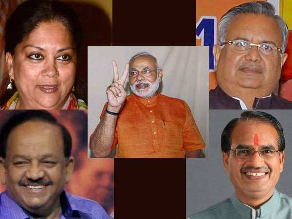 మధ్యప్రదేశ్లో శివరాజ్ సింగ్ నేతృత్వంలో బిజెపి అధికారాన్ని నిలబెట్టుకోగా, రాజస్థాన్లో వసుంధరా రాజే ఆధ్వర్యంలో ముఖ్యమంత్రి అశోక్ గెహ్లాట్ ప్రభుత్వాన్ని మట్టికరిపించింది. ఢిల్లీలో బిజెపి గెలుపు అవకాశాలను ఆమ్ ఆద్మీ పార్టీ దెబ్బ కొట్టింది. అయినప్పటికీ అత్యధిక స్థానాలు గెలుచుకొని అతిపెద్ద పార్టీగా అవతరించింది. ఛత్తీస్గఢ్లోను రమణ్ సింగ్ నేతృత్వంలో బిజెపి స్వల్ప ఆధిక్యంతో మరోసారి విజయం సాధించింది.