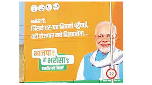 బీజేపీ రాష్ట్రంలో తాజాగా ఏర్పాటు చేసిన పోస్టర్లలో కేవలం ప్రధాని నరేంద్రమోడీ లైఫ్ సైజ్ ఫొటోను మాత్రమే ఉంచారు. ఎన్డీయే కూటమి తరఫున సీఎం అభ్యర్ధిగా ఉన్న జేడీయూ నేత నితీశ్కు మాత్రం ఈ పోస్టర్లలో స్ధానం కల్పించలేదు. తద్వారా ఈ ఎన్నికలకు తాము ప్రధాని మోడీ బొమ్మతోనే వెళ్తున్నట్లు బీజేపీ చెప్పకనే చెప్పినట్లయింది. ఇప్పటికే నితీశ్ కుమార్కు సీఎంగా ఎప్పటినుంచో మద్దతిస్తున్న బీజేపీ నేతలకు ఈసారి ఆయన స్ధానంలో తమ పార్టీ అభ్యర్ధిని సీఎం చేయాలనే ఆలోచన వచ్చింది. ఇందుకు అనుగుణంగా కదుపుతున్న పావుల్లో భాగంగానే బీజేపీ వ్యూహాత్మకంగా వ్యవహరిస్తుందన్న విమర్శలున్నాయి.