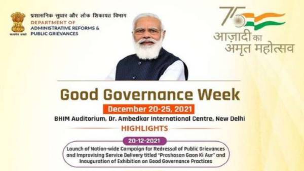 గ్రామాలకు సుపరిపాలనను తీసుకెళ్లాలనే నినాదంతో నరేంద్ర మోడీ నేతృత్వంలోని కేంద్ర ప్రభుత్వం డిసెంబర్ 20 నుంచి రాష్ట్రాలతో పాటు దేశవ్యాప్తంగా 'గుడ్ గవర్నెన్స్ వీక్' ప్రచారాన్ని ప్రారంభిస్తోంది. ప్రాథమిక అంచనా ప్రకారం దేశవ్యాప్తంగా 10 లక్షలకు పైగా పెండింగ్లో ఉన్న ప్రజా ఫిర్యాదులను పరిష్కరించడం, రాష్ట్ర స్థాయిలో పౌర పట్టికలను అప్ డేట్ చేయడం దీని ప్రధాన లక్ష్యం. పౌరులకు మరింత మెరుగైన సేవలు అందించడమే లక్ష్యంగా ఈ కార్యక్రమం ప్రారంభిస్తున్నట్లు కేంద్ర ప్రభుత్వ వర్గాలు చెప్తున్నాయి.
