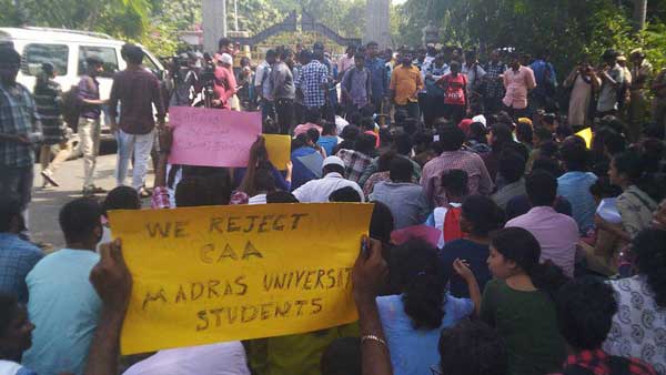 మెరీనా బీచ్ కు ఎదురుగా మద్రాసు యూనివర్శిటీ ప్రధాన ద్వారం (మెయిన్ గేట్) దగ్గర ఆందోళన చేస్తున్న విద్యార్థులు కేంద్రంలో అధికారంలో ఉన్న బీజేపీ, ఆర్ఎస్ఎస్, ఏబీవీపీలకు వ్యతిరేకంగా పెద్దఎత్తున నినాదాలు చేశారు. వెంటనే పౌరసత్వ సవరణ బిల్లును ఉపసంహరించుకోవాలని, లేదంటే మా సత్తా చూపిస్తామని విద్యార్థి సంఘాలు కేంద్ర ప్రభుత్వాన్ని హెచ్చరించాయి. మొత్తం మీద మద్రాసు యూనివర్శిటీ క్యాంపస్ లో పోలీసులు ప్రవేశించడంతో ఉద్రిక్త పరిస్థితులు నెలకొన్నాయి. పొలీసులు సైతం వారి వాహనాలను కొద్దికొద్దిగా క్యాంపస్ బయటకు తరలిస్తున్నారు.