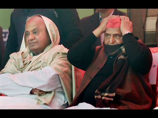మోడీ ప్రభుత్వానికి వ్యతిరేకంగా జంతర్ మంతర్ వద్ద జరిగిన ధర్నాలో శాలువాలతో సమాజ్ వాదీ పార్టీ అధినేత ములాయం సింగ్, ఆ ప్రక్కనే జెడీఎస్ ఛీప్ హెచ్డి దేవ్ గౌడ.
