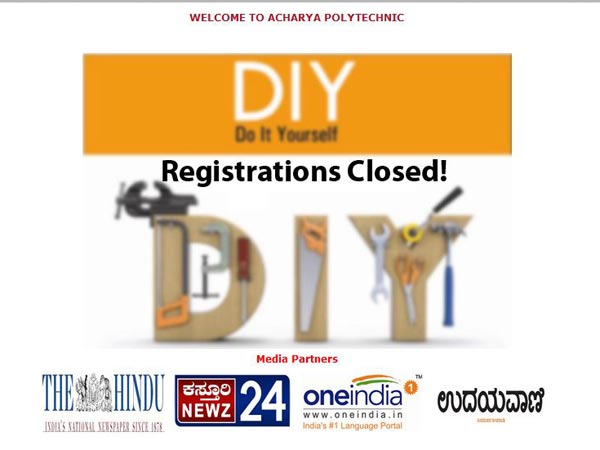 ప్రస్తుతం ఆచార్య ఇనిస్టిట్యూట్ (పాలీటెక్నికల్/టెక్నికల్ క్యాంపస్), డైరెక్టర్ ఆఫ్ టెక్నికల్ ఎడ్యుకేషన్ సంయుక్తంగా ఇప్పటికే పేరుపొందిన ‘డూ యిట్ యువర్ సెల్ఫ్ టెక్నికల్ ప్రాజెక్ట్ కాంపిటీషన్' నిర్వహిస్తున్నాయి. ఫిబ్రవరి 16, 17 తేదీల్లో నిర్వహించనున్న ఈ కార్యక్రమాన్ని ముఖ్య అతిథిగా హాజరవుతున్న రాష్ట్ర ఉన్నత విద్యాశాఖ మంత్రి ఆర్వి దేశ్పాండే ప్రారంభించనున్నారు. యెలహంక ఎమ్మెల్యే విశ్వనాథ్ కార్యక్రమానికి హాజరు కానున్నారు.