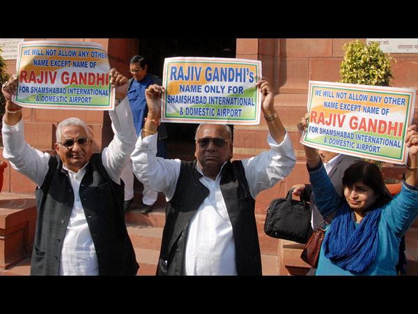 శంషాబాద్ రాజీవ్ గాంధీ అంతర్జాతీయ విమానాశ్రయం దేశీ టెర్మినల్కు ఎన్టీఆర్ పేరు పెట్టడాన్ని నిరసిస్తూ కాంగ్రెసు సభ్యులు మంగళవారం రాజ్యసభలో ప్లకార్డులు ప్రదర్శించారు.