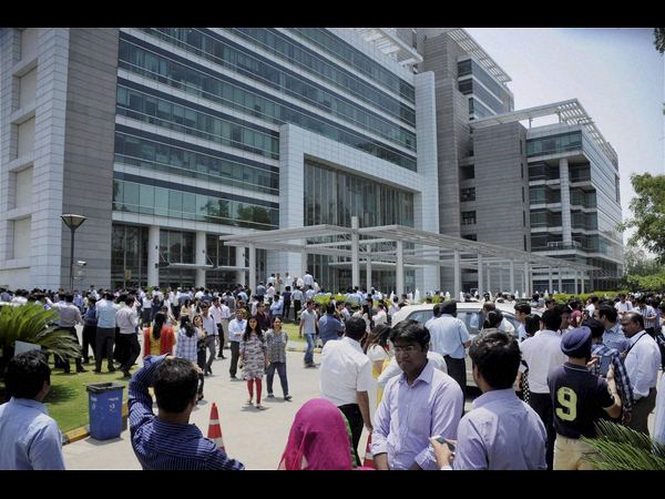 భూకంప ప్రభావంతో గుర్గావ్లో తాము పని చేసే కంపెనీ భవనం నుంచి బయటికి వచ్చిన ఉద్యోగులు.