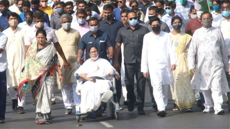 మరోవైపు, నందిగ్రామ్లో ఓ చిన్న సంఘటనలో మమతా కాలికి గాయమైంది. ఆమె కాలికి ప్లాస్టర్ వేసి కట్టు కట్టారు. ఆ తరువాత ఆమె వీల్ చెయిర్లో కూర్చునే ప్రచారాల్లో పాల్గొన్నారు.