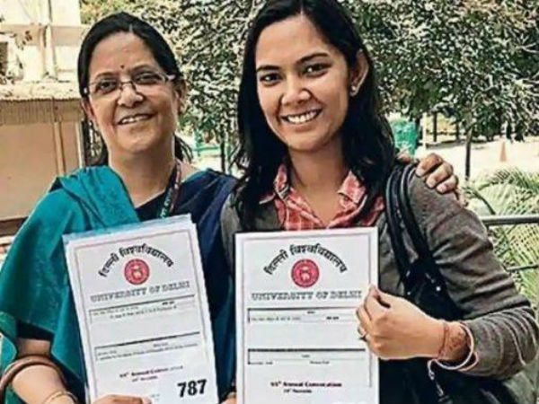 ఇదిగో ఇక్కడ ఫోటోలో కనిపిస్తున్న ఇద్దరి మహిళల పేర్లు మాలా దత్తా, శ్రేయా మిశ్రా. ఒకరి వయస్సు 56 ఏళ్లు ఉండగా మరొకరి వయస్సు సరిగ్గా అందులో సగం అంటే 28 ఏళ్లు . ఇంతకీ వీరిద్దరు ఎవరనేగా మీడౌటు అక్కడికే వస్తున్నాం. ఈ ఇద్దరూ తల్లీ కూతుళ్లు. ఇద్దరికీ చదువంటే ప్రాణం. తల్లి మాలాదత్తా కాలేజీ చదువులు పూర్తి చేసి దాదాపు 34 ఏళ్లు అవుతోంది. అయితేనేం చదవాలన్న కోరిక ఆమెను విడనాడలేదు. 34 ఏళ్ల తర్వాత పీహెచ్డీ డిగ్రీ పొందింది. ఇది ఇలా ఉంటే... ఆమెకు మరో సంతోషాన్నిచ్చే వార్త ఏమిటంటే తన కూతురు కూడా పీహెచ్డీ చేసి ఇద్దరూ ఒకే రోజున ఒకే యూనివర్శిటీ నుంచి పీహెచ్డీ డిగ్రీని పొందారు.