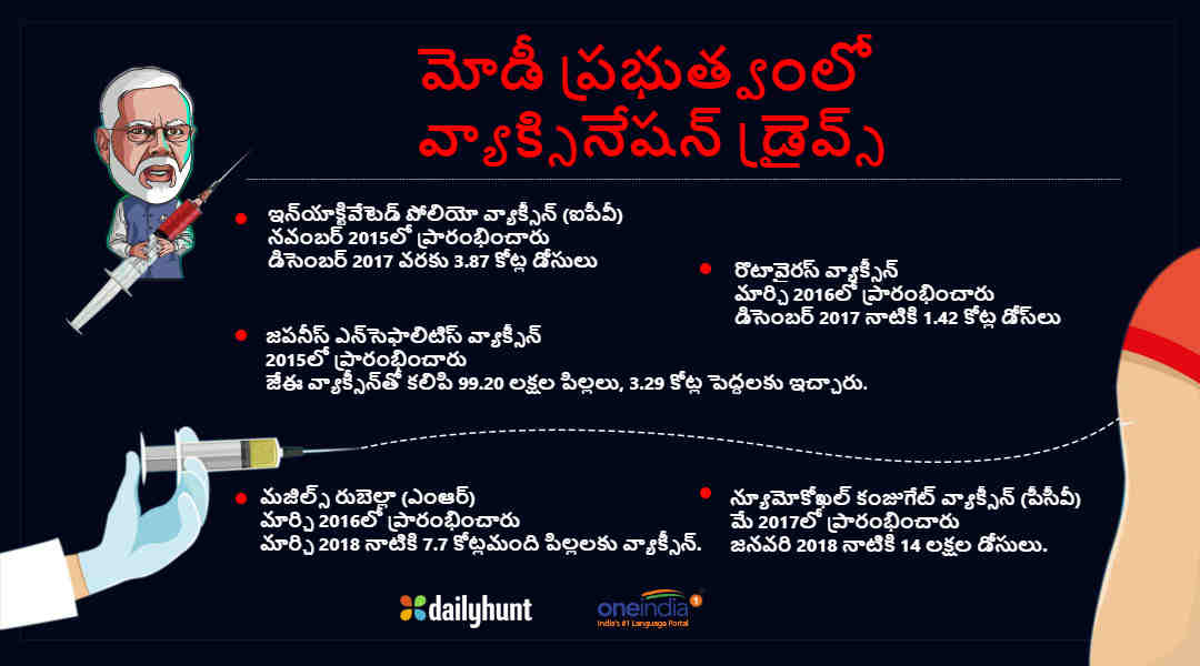 అంతేకాదు, మోడీ ప్రభుత్వం వ్యాధి నిరోదక శక్తి పైన విస్తృత ప్రచారం చేస్తోంది. మిషన్ ఇంద్రధనుష్ ద్వారా 528 జిల్లాల్లో 3.15 కోట్లకు పైగా చిన్నారులకు, 80 లక్షల మంది గర్భిణీ స్త్రీలకు టీకాలు ఇచ్చారు.