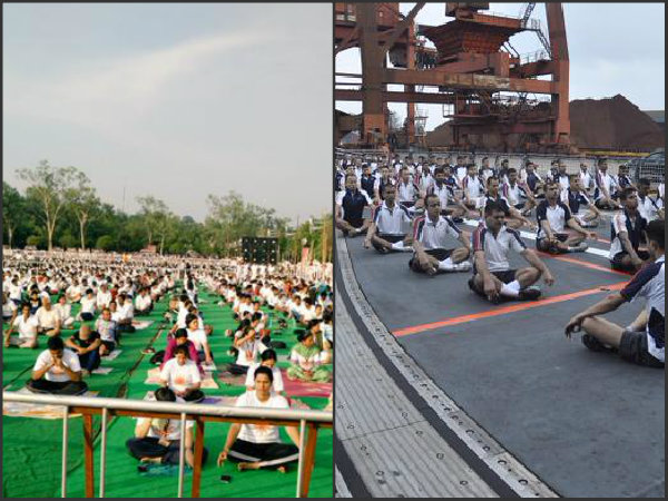 దక్షిణ చైనా సముద్రంలోని మలేషియా కౌంటన్లో అంతర్జాతీయ యోగా దినోత్సవాన్ని జరుపుకుంటున్న భారత నావికాదళం అధికారులు, సిబ్బంది.