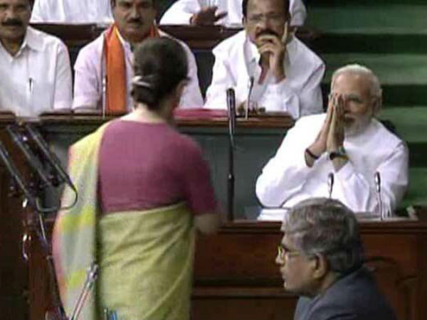 లోకసభలో ఏఐసిసి అధ్యక్షురాలు సోనియా గాంధీకి భారత ప్రధానమంత్రి నరేంద్ర మోడీ నమస్కరిస్తున్న దృశ్యం. సోనియా ప్రతి నమస్కారం చేశారు.