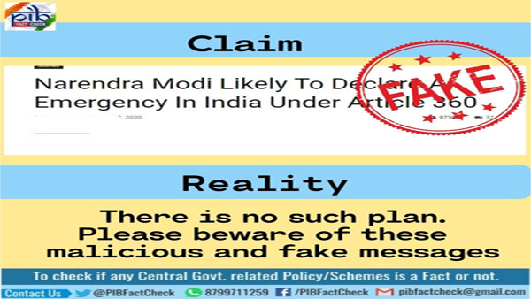 కొవిడ్-19 వేగంగా వ్యాపిస్తున్న నేపథ్యంలో భారత రాజ్యాంగంలోని ఆర్టికల్ 360 కింద కేంద్ర ప్రభుత్వం ఆర్థిక అత్యవసర పరిస్థితి ప్రకటిస్తుందని సదరు వెబ్సైట్ పేర్కొంది. అయితే, ఇది ఒక తప్పుడు వార్తా కథనం అని, కేంద్ర ప్రభుత్వం అలాంటి నిర్నయం ఏమీ తీసుకోవడం లేదని ప్రసార భారతి న్యూస్ సర్వీస్ స్పష్టం చేసింది. ఇలాంటి వార్తలను నమ్మవద్దని తేల్చి చెప్పింది.