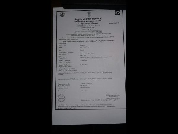 తాజాగా అమ్మ మరణాన్ని ధ్రువీకరిస్తూ గ్రేటర్ చెన్నై కార్పొరేషన్ డెత్ సర్టిఫికెట్(మరణ ధ్రువీకరణ) ను విడుదల చేసింది.