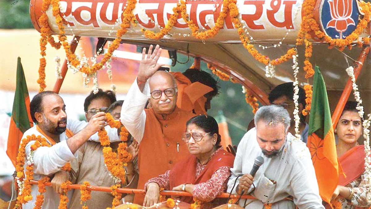 1990లోఒక టొయోటా మినీ ట్రక్కును రథంగా మార్చి గుజరాత్లోని సోమ్నాథ్ ఆలయం నుంచి అయోధ్యలో రామజన్మభూమి దాకా ఆయన ప్రారంభించిన యాత్రకు విస్తృత మద్దతు లభించింది. 1984 లోక్సభ ఎన్నికల్లో 2 సీట్లతో ప్రస్థానం ప్రారంభించిన బీజేపీని వరుసగా రెండుసార్లు అధికారంలోకి వచ్చి రామమందిరాన్ని నిర్మించడానికి అవసరమైన మద్దతు రావటంలో అద్వానీదే కీలక పాత్ర.