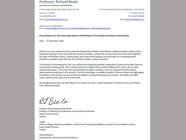 జయలలిత ఆరోగ్యం పైన లండన్ వైద్యులు రిచర్డ్ బాలే కూడా ప్రకటన చేశారు. జయ ఆరోగ్యం విషమంగా ఉందని తెలిపారు. అత్యవసర చికిత్స కొనసాగుతోందని డాక్టర్లు వెల్లడించారు.