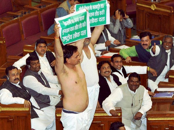 మరోవైపు ఉత్తర ప్రదేశ్లో రాష్ట్రీయ లోక్ దళ్ ఎమ్మెల్యేలు అసెంబ్లీలో తమ కుర్తాలు విప్పారు. ముఖ్యమంత్రి అఖిలేష్ యాదవ్ ప్రభుత్వం రైతు వ్యతిరేక విధానాలను అవలంభిస్తోందని ఆరోపిస్తూ లోక్ దళ్ ఎమ్మెల్యేలు కుర్తా విప్పారు.