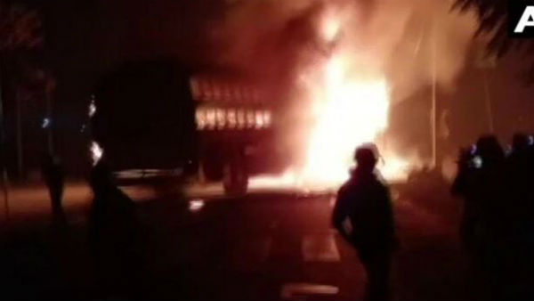 Kannauj: A bus carrying 50 passengers catches fire after collision with a truck on GT Road. Fire tenders have rushed to the spot. More details awaited pic.twitter.com/aRdZC8ElhG