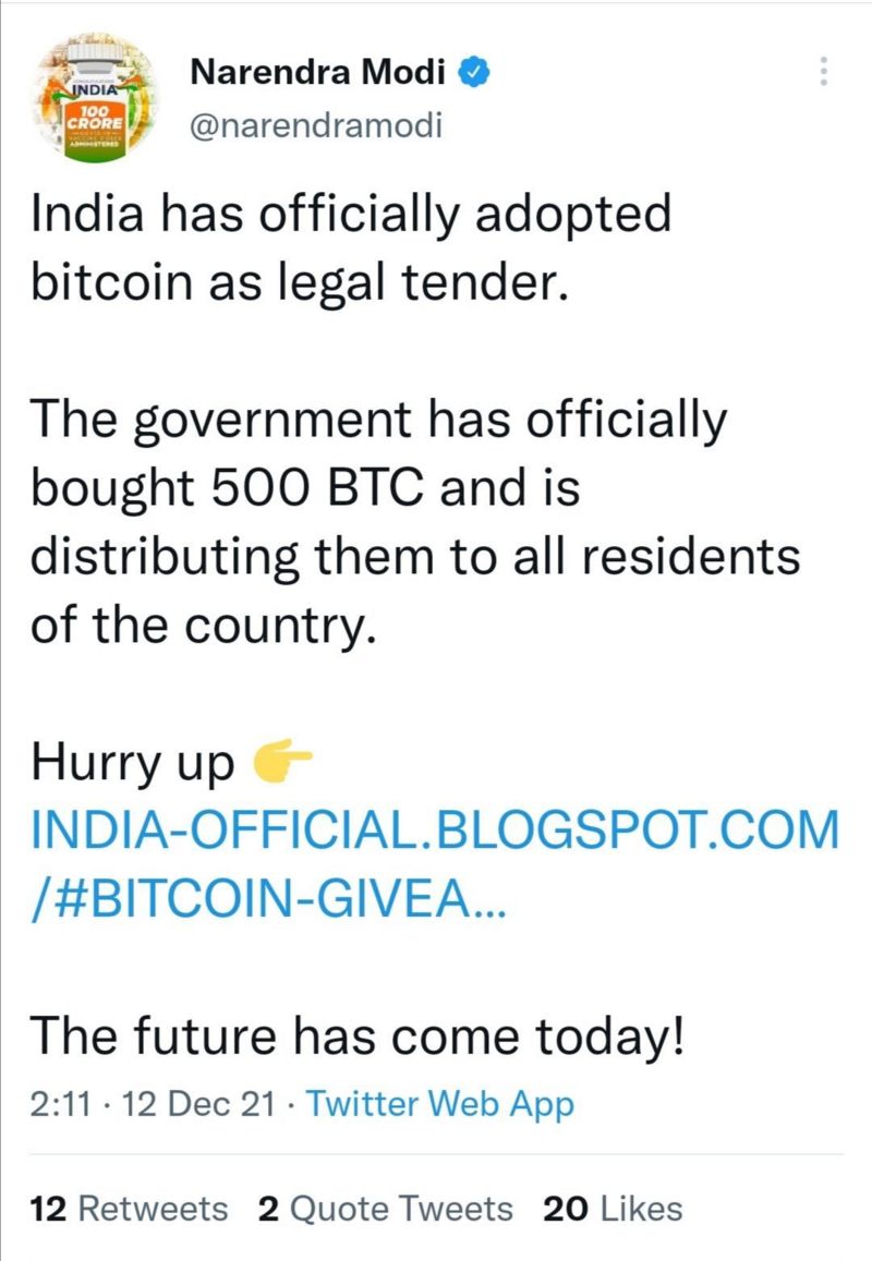 అంతేకాదు.. 500 బిట్కాయిన్లను భారత్ కొనుగోలు చేసిందని, వాటిని ప్రజలందరికీ పంపిణీ చేస్తోందని కూడా ఈ ట్వీట్లో చెప్పారు.