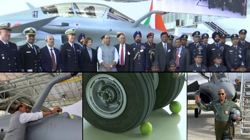 టైర్ల కింద నిమ్మకాయలు.. దిష్టి టెంకాయ: రాఫెల్ ను అందుకున్న రాజ్ నాథ్