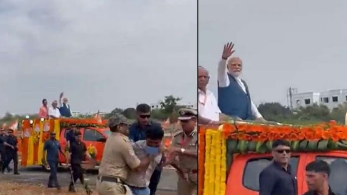 #WATCH | Karnataka: Security breach during PM Modi's roadshow in Davanagere, earlier today, when a man tried to run towards his convoy. He was later detained by police.