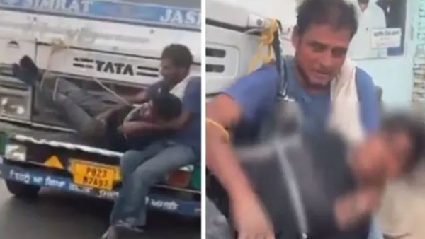 See.. In Muktsar, a young man is being tied in front of a truck and taken to the police station for stealing two gunny bags.#Punjab #Muktsar pic.twitter.com/q9WgIwO9A2