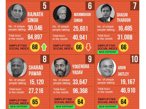 భారతీయ జనతా పార్టీ అధ్యక్షుడు రాజ్నాథ్ సింగ్ 68, ప్రధాని మన్మోహన్ సింగ్, కాంగ్రెస్ ఎంపి శశిథరూర్ 66వ ర్యాంకులతో తర్వాతి స్థానాల్లో ఉన్నారు. మరో ముగ్గురు కూడా ఈ జాబితాలో చేరారు. ఎన్సిపి నాయకుడు శరద్ పవార్ 65, ఆప్ నాయకుడు యోగేంద్ర యాదవ్ 64, బిజెపి నేత అరుణ్ జైట్లీ 64వ ర్యాంకులలు సాధించారు. విశేషమేమిటంటే మార్చి నెలలో సోషల్ బజ్లో ఎక్కువ రేటును నమోదు చేసిన అరవింద్ కేజ్రివాల్.. నరేంద్ర మోడీని వెనక్కి నెట్టి సంచలనం సృష్టించాడు.
