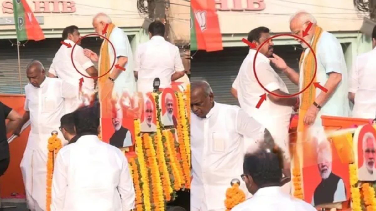 వేపమూడు జంక్షన్ నుండి వడసేరి అన్నా విగ్రహం వరకు సుమారు 1.5 కిలోమీటర్ల దూరం సాగిన ప్రధాని రోడ్షోకు ఇరువైపులా ప్రజలు, కార్యకర్తలు బారులు తీరారు. విజయవంతంగా రోడ్షో ముగిసిన తర్వాత, వడసేరి అన్నా విగ్రహం వద్ద వాహనం నుండి దిగిన ప్రధాని మోడీ.. అన్నా, ఎం.జి.ఆర్. విగ్రహాలకు, అంబేద్కర్ చిత్రపటానికి పూలమాలలు వేసి శ్రద్ధాంజలి ఘటించారు. ఈ క్రమంలో ప్రచార వాహనం నుంచి అందరూ కిందకు దిగేందుకు సిద్ధమయ్యారు. అనంతరం మోడీ వెనుక నిలబడిన అన్నామలై, పొన్ రాధాకృష్ణన్ కిందకు దిగారు. కానీ ప్రధాని మోడీ పక్కనే ఉన్న ఎడప్పాడి పళనిస్వామి, నైనార్ నాగేంద్రన్ ముందు నిలబడిన కార్యకర్తలకు అభివాదం చేస్తూనే ఉన్నారు. ఆ సమయంలో ప్రధాని మోడీ ఎడప్పాడి పళనిస్వామిని టచ్ చేస్తూ... 'చాలు, చాలు దిగండి' అంటూ వారించారు. దీంతో ఎడప్పాడి పళనిస్వామి కిందకు దిగారు.