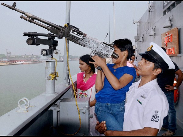 కోల్కత్తాలోని కిదిర్పుర్ డాక్ యార్డ్లో నేవీ వీక్ సెలబ్రేషన్స్ సందర్భంగా ఐఎన్ఎస్ సుమిత్ర యుద్దనౌకపై చిన్నారి టెలిస్కోప్ చూసేందుకు సహాయపడుతున్న నౌకదళ సిబ్బంది.