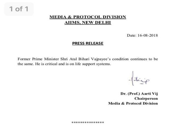 కాగా, గురువారం సాయంత్రం 5.05గంటలకు వాజపేయి మృతి చెందారని వైద్యులు ప్రకటించారు.