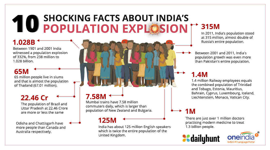1901 నుంచి 2001 మధ్య భారత దేశ జనాభా ఎన్నో రెట్లు పెరిగింది. 238 మిలియన్ల నుంచి 1.028 బిలియన్లకు చేరింది. ఇది 332 శాతం పెరుగుదల.