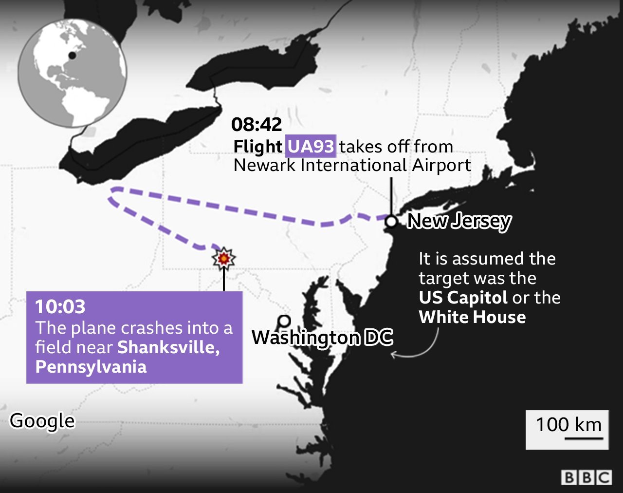 ప్రయాణికులందరూ దాడిచేస్తూ ఉండగానే గంటకు 930 కిలోమీటర్ల కంటే ఎక్కువ వేగంతో విమానం పెన్సెల్వేనియాలో షాంక్స్విల్లేలోని ఒక బహిరంగ ప్రదేశంలో కూలింది.