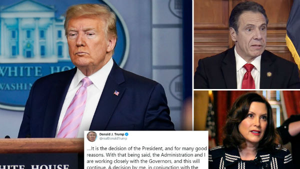 ‘కరోనా పీక్ పాయింట్ దాటేశాం. ఇక ఎకానమీపై దృష్టి సారిస్తాం. వ్యాపార, వాణిజ్యాల్ని తిరిగి ప్రారంభిస్తాం'అని కౌమో పత్రికాముఖంగా వెల్లడించారు. కానీ ఆయన ప్రకటనను ప్రెసిడెంట్ ట్రంప్ తీవ్రంగా ఖండించారు. రాజ్యాంగం ప్రకారం తనకు విశేషమైన అధికారాలుంటాయని, వ్యవస్థల రీఓపెనింగ్ పై తుది నిర్ణయం తనదేనని, ఈ విషయంలో రాష్ట్రప్రభుత్వాలన్నీ ఫెడరల్ సర్కారుకు లోబడి ఉండాలని ట్రంప్ హెచ్చరించారు. మొదట్లో లాక్ డౌన్ అవసరమే లేదన్న ట్రంప్.. ఇప్పుడిలా యూటర్న్ తీసుకోవడం, రాష్ట్ర ప్రభుత్వాలను హెచ్చరించడం గవర్నర్లకు మింగుడు పడటంలేదు. దీంతో ప్రెసిడెంట్ కు వ్యతిరేకంగా గవర్లన్లు జట్టుగా ఏర్పడ్డారు.