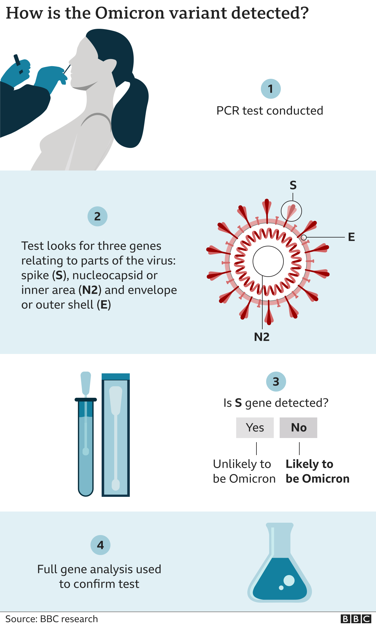 పీసీఆర్ పరీక్షలో పాజిటివ్ ఫలితాన్ని చూపిస్తూ ఒమిక్రాన్ వైరస్లా అనుమానం కలిగించేలా ఉన్న స్వాబ్లను జెనెటిక్ అనాలసిస్ కోసం ల్యాబ్లకు పంపించారు. జెనోమిక్ సీక్వెన్సింగ్ అనే సాంకేతికతను ఉపయోగించి వాటిని విశ్లేషించారు.