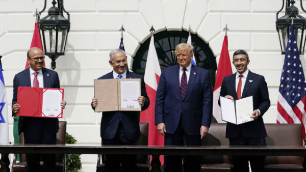 వైట్హౌస్లో డొనాల్డ్ ట్రంప్ సమక్షంలో బహ్రెయిన్-ఇజ్రాయెల్-యునైటెడ్ అరబ్ ఎమిరేట్స్ మధ్య శాంతి ఒప్పందాలు కుదిరాయి. డొనాల్డ్ ట్రంప్తో పాటు ఇజ్రాయెల్ ప్రధానమంత్రి బెంజమిన్ నెతన్యాహు, బహ్రెయిన్, ఎమిరేట్స్ విదేశాంగ శాఖ మంత్రులు అబ్దుల్ లతీఫ్ అల్ జయానీ, అబ్డుల్లా బిన్ జయేద్ ఈ ఒప్పందాలపై సంతకాలు చేశారు. వాటిని పరస్పరం బదలాయించుకున్నారు. మధ్య తూర్పు ఆసియాలో ఒక చారిత్రాత్మక, సువర్ణాధ్యాయం ఆరంభమైందని ట్రంప్ వ్యాఖ్యానించారు.