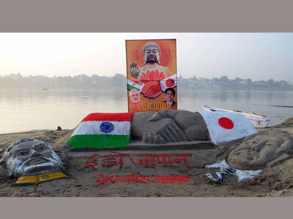 న్యూఢిల్లీ: జపాన్ ప్రధాని షింబో అబే మూడు రోజుల భారత పర్యటనను స్వాగతిస్తూ వారణాసిలో సైకతశిల్పం రూపొందించారు. భారత్, జపాన్ల మధ్య ద్వైపాక్షిక సంబంధాలు మరింతగా బలపడాలని కోరుకుంటూ సైకత శిల్పి రాజేశ్ కుమార్ వారణాసిలోని అస్సీ ఘాట్లో ఈ సైకత శిల్పాన్ని రూపొందించారు.