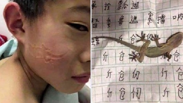 ఇంతకీ ఏం జరిగిందంటే... తైవాన్కు చెందిన ఓ చిన్నారి హోమ్ వర్క్ చేస్తూ పుస్తకంపై తల వాల్చి నిద్రలోకి జారుకున్నాడు. అయితే ఆ సమయంలో పుస్తకంపై బల్లి ఉండటాన్ని అతను గమనించలేదు. మూతలు పడుతున్న కళ్లతో పుస్తకంపై తల పెట్టి గాఢ నిద్రలోకి వెళ్లాడు. కాసేపటి తర్వాత లేచి చూసుకుంటే... ముఖంపై బల్లి అచ్చు కనిపించింది. ఇదేంటా అని పుస్తకం వైపు చూస్తే... అక్కడ చచ్చిన బల్లి కనిపించింది. ఆ చిన్నారి తల కింద నలిగిపోయి అది చచ్చిపోయింది.