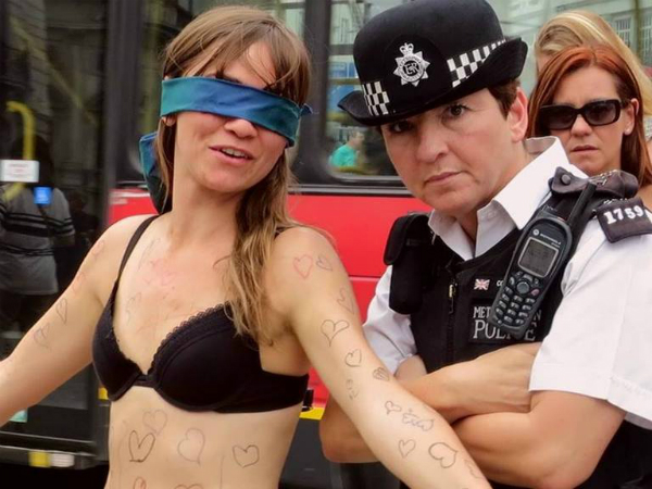 'ఈటింగ్ డిజార్డర్'(ఎప్పుడూ ఏదో తినాలనిపిస్తుండటం లేక అసలే తినలేక పోవడం) నుంచి బయటపడ్డ జే వెస్ట్ అనే ఈ యువతి రద్దీగా ఉండే లండన్ పికాడిలి సర్కస్ కూడలిలో కళ్లకు గంతలు కట్టుకొని పై దుస్తులను విప్పేసిసి నిలబడింది. అంతేగాక, తన పక్కకి ఒక ఫ్లకార్డును కూడా పెట్టింది.