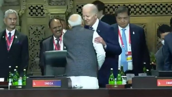 బైడెన్ తనవైపు వస్తోండటాన్ని గమనించిన మోదీ తన కుర్చీ నుంచి లేచి.. ఆయనకు షేక్ హ్యాండ్ ఇచ్చారు. అనంతరం ఆత్మీయంగా ఆలింగనం చేశారు. ఆ సమయంలో అక్కడే నిల్చుని ఉన్న విదేశాంగ శాఖ మంత్రి సుబ్రహ్మణ్యం జైశంకర్, జాతీయ భద్రత సలహాదారు అజిత్ దోవల్ను బైడెన్కు పరిచయం చేశారు మోదీ. కొద్దిసేపు అక్కడే నిల్చుని మాట్లాడారు. ఆ తరువాత మోదీ పక్క కుర్చీలోనే ఆసీనులయ్యారు బైడెన్. ఫ్రాన్స్ అధ్యక్షుడు ఇమ్మాన్యుయేల్ మాక్రాన్లతో ప్రధాని మోదీ కొద్దిసేపు సంభాషించారు.