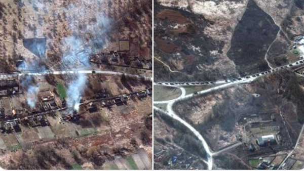 ఆంటోనోవ్ విమానాశ్రయం నుంచి ప్రిబిర్క్స్ పట్టణం మధ్యలో ఉన్న రహదారిపై మొత్తం రష్యా సైనిక వాహనాలు, ట్యాంకులు, ఫిరంగి దళాలతో నిండిపోయినట్లు ఈ చిత్రాలు చెబుతున్నాయి. అలాగే ఈ రహదారికి సమీపంలో ఉన్న భవనాలు కాలిపోతున్నట్లుగా చిత్రాల్లో కనిపిస్తోంది. అంటే, రష్యా బలగాలు దాడుల్లో ఈ భవనాలు ధ్వంసమైనట్లు తెలుస్తోంది.