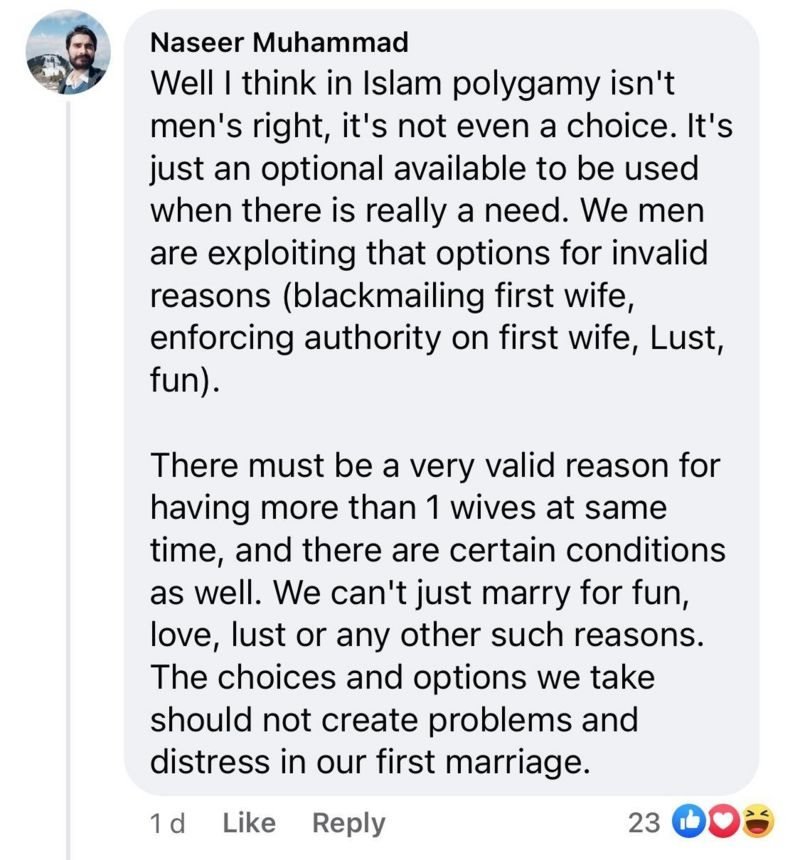 ''ఇస్లాంలో బహు భార్యత్వం హక్కు కాదు, ఆప్షన్ మాత్రమే. అది కూడా అవసరానికి మాత్రమే వాడుకోవాల్సి ఉంటుంది. కానీ చాలామంది మొదటి భార్యను వేధించడానికి, సరదాకి, కామం కోసం ఈ నియమాన్ని వాడుకుంటున్నారు'' అని నాసిర్ ముహమ్మద్ అనే యూజర్ వ్యాఖ్యానించారు.