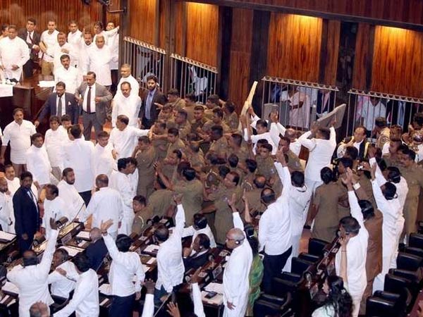 అంతకుముందు, పార్లమెంటు సమావేశాలు ఉదయం ప్రారంభమయ్యాయి. కత్తులతో వచ్చిన విక్రమ్ సింఘే పార్టీకి చెందిన ఇద్దరు శాసనసభ్యులను వెంటనే అరెస్టు చేయాలని రాజపక్సెకు మద్దతుగా ఉన్న ఎంపీలు డిమాండ్ చేశారు. అప్పటి నుంచి గొడవ మొదలైంది. రాజపక్సె మద్దతుదారులు స్పీకర్ జయసూర్యపైకి పలు వస్తువులను విసిరేశారు. ఎంపీలు ఒకరిపై మరొకరు కారప్పొడి చల్లుకుంటూ దాడులకు దిగారు. సభ రణరంగాన్ని తలపించడంతో 19వ తేదీకి వాయిదా వేశారు.