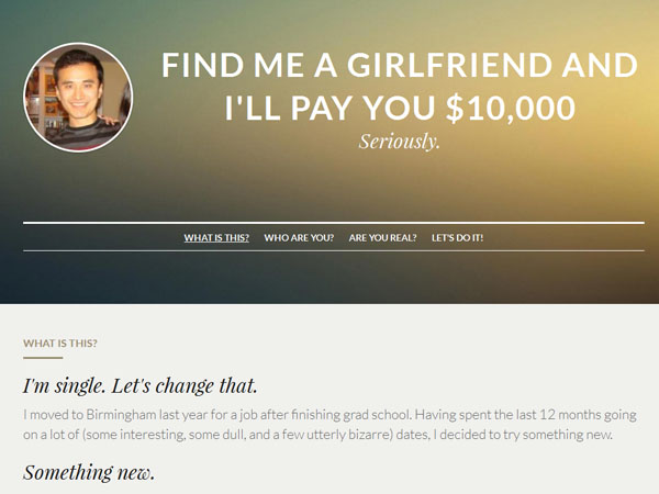 తనకు నచ్చిన గర్ల్ఫ్రెండ్ను వెతికిపెట్టిన వారికి 10వేల డాలర్లు ఇస్తానని ప్రకటించాడు. అమెరికాలోని అలబామాకు చెందిన రెన్ యు(29) ఇటీవలే హార్వర్డ్ బిజినెస్ స్కూల్ నుంచి డిగ్రీ పట్టా పుచ్చుకున్నాడు.