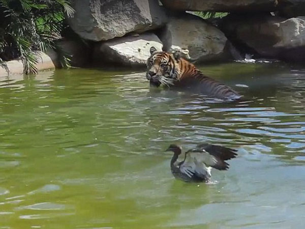 ఆస్ట్రేలియాలోని సింబియో వైల్డ్ లైఫ్ పార్కులో ఓ బాతు పులితో ఆ ఆట ఆడుకుంది. జూలోని ఎన్క్లోజర్లో ఈ సంఘటన జరిగింది.