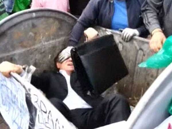 ప్రజాగ్రహం: ఆ ఎంపీని చెత్తకుండీలో పడేశారు(ఫొటో)