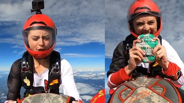 విమానంలో ఉండి పై నుంచి చూస్తేనే భయం వేస్తోంది. ఒక స్కై డైవ్ చేసేవారికి గుండె ధైర్యం బాగానే ఉండాలి అవును వారు చాలా ధైర్యవంతులు అయి ఉంటారు. మరీ స్కై డైవ్ చేస్తూ.. ఫుడ్ తినడం అంటే మాములు విషయం కాదు కదా... నిజమే.. కానీ ఒకరు అలా చేశారు. ఆ వీడియోను ఇన్ స్టాలో షేర్ చేయడంతో వైరల్ అవుతుంది. ఆ వీడియో చూసి.. అమ్మాయి ధైర్యం సాహసాలు ఎలా ఉన్నాయో లుక్కేయండి.