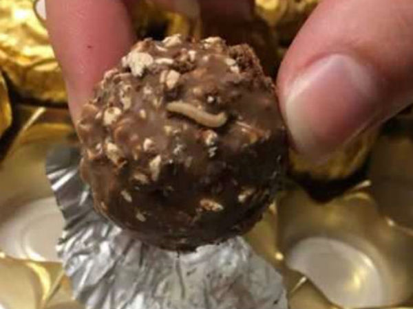 అమెరికాలోని ఇల్లినాయిస్ కు చెందిన రాచెల్ విల్లే.. ఫెర్రారో రోచర్ చాక్లెట్ లడ్డూలు కొనుక్కుని వాటిని రూమ్ కు తీసుకెళ్లి ఓపెన్ చేసి సగం తిన్నాక లడ్డూలోంచి తెల్లటి పురుగులు బయటికి రావడం చూసి కెవ్వు