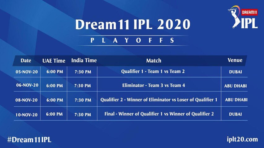 వచ్చేెనెల 5వ తేదీన ప్లేఆఫ్ మ్యాచ్లు ఆరంభమౌతాయి. 5, 6, 8 తేదీల్లో ప్లేఆఫ్స్ నిర్వహిస్తారు. 10వ తేదీన ఫైనల్ ఉంటుంది. ప్లేఆఫ్ దశలో తొలి మ్యాచ్ దుబాయ్ ఇంటర్నేషనల్ స్టేడియంలో జరుగనుంది. ఫైనల్కు క్వాలిఫై అయ్యే జట్టును తేల్చేసే మ్యాచ్ ఇది. 6న ఎలిమినేటర్, 8న సెకెండ్ క్వాలిఫయర్ మ్యాచ్లు ఉంటాయి. 10న దుబాయ్లోనే ఫైనల్ మ్యాచ్ను నిర్వహిస్తాు. 8న జరిగే సెకెండ్ క్వాలిఫయర్లో గెలిచే జట్టు ఫైనల్లో తొలి క్వాలిఫయర్ టీమ్ను ఢీ కొడుతుంది.
