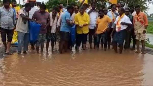ఏపీలో వర్ష బీభత్సం: రోడ్డుపై చేపలు వదిలిన టీడీపీ నేత..