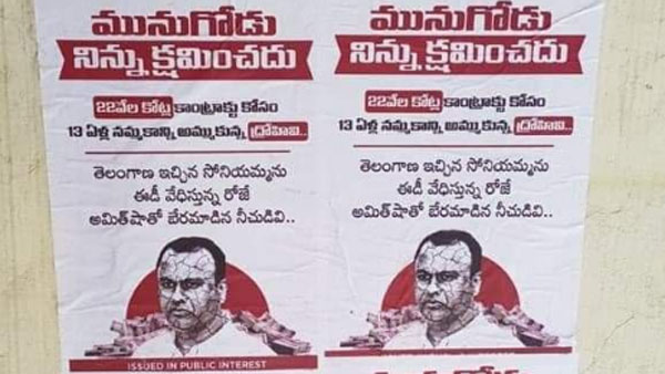 మునుగోడులో రాజగోపాల్ రెడ్డికి వ్యతిరేకంగా పోస్టర్స్ వెలిశాయి. అందులో రాజగోపాల్ రెడ్డిని మునుగోడు నిన్ను క్షమించదు అని రాశారు. రూ. 22 వేల కోట్ల కాంట్రాక్ట్ కోసం.. 13 ఏళ్ల నమ్మకాన్ని అమ్ముకున్న ద్రోహివి అని రాసి ఉంది. తెలంగాణ ఇచ్చిన సోనియమ్మను ఈడీ వేధిస్తున్న రోజే అమిత్ షాతో బేరమాడిన నీచుడివి అని స్పష్టంగా పోస్టర్లలో కనిపిస్తోంది. పోస్టర్లు కేవలం మునుగోడులోనే కాదు.. నల్లగొండ జిల్లా వ్యాప్తంగా వెలిశాయి. నారాయణపురం, చౌటుప్పల్లో ఎక్కువగా కనిపిస్తున్నాయి. పోస్టర్స్ ఎవరూ వేశారనే అంశంపై స్పష్టత రాలేదు.